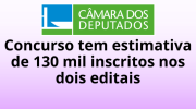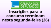 26/01/2026 13h10 Concurso Câmara dos Deputados: inscrições terminam nesta segunda-feira (26)Candidatos devem se inscrever no site do Cebraspe e efetuar o pagamento da taxa até 28 de janeiro; provas estão marcadas para 8 de março de 2026 | |